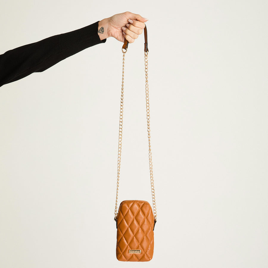 Cómodo y útil porta celular camel ecocuero ,correa de cadena para darle todo un toque de elegancia !!